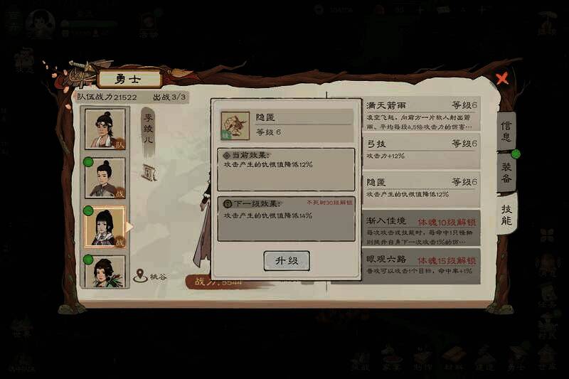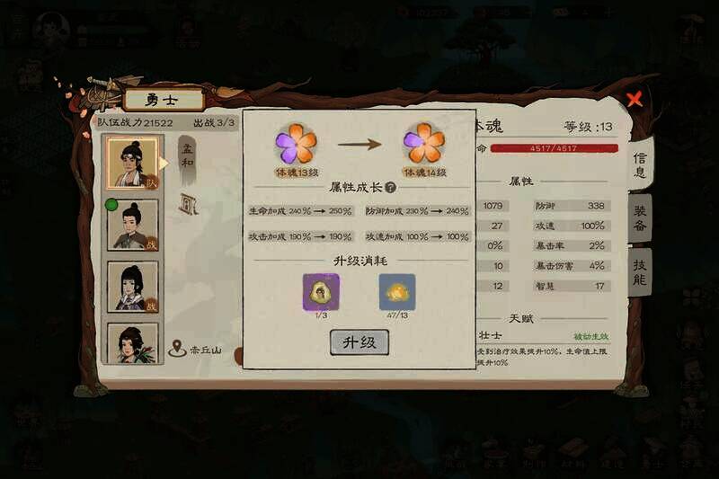 注:可通过提升不死树等级来升级勇者的主动被动技能,每提升五级不死树可升级一级勇者都主动被动技能(不死树需要每天施肥升级)