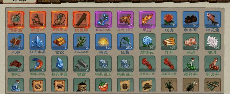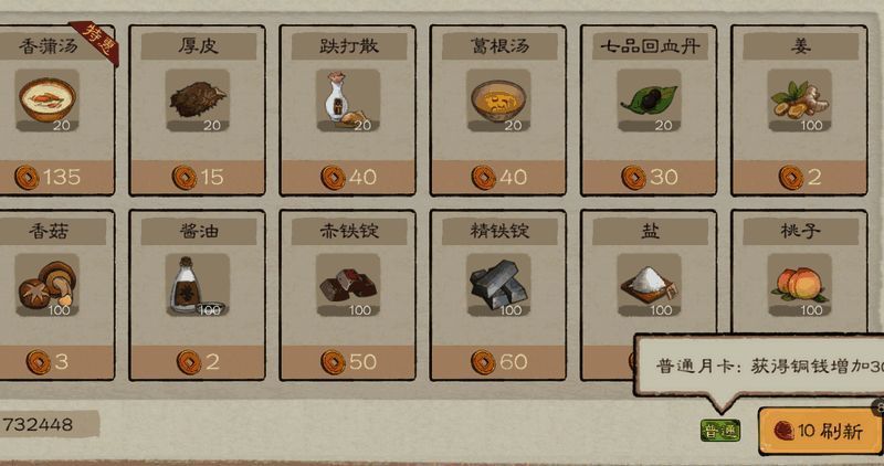 桃谷货郎每天要买铁锭,库存维持在五百左右即可,以及大量的种子,每种类型的种子库存维持在一万左右即可。新手进游戏第一天要买葛根汤应急,第二天看自己,比如我第二天已经自给自足了,所以不买了。