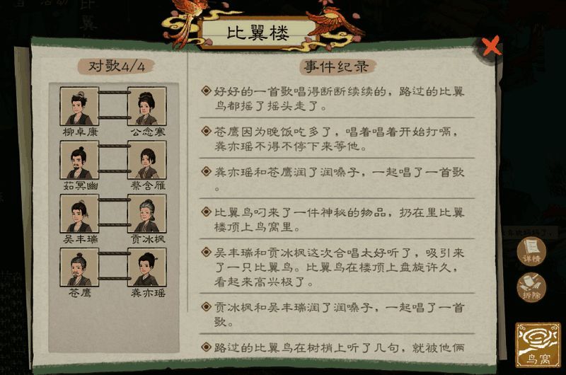关于比翼楼:如图二所示,游戏里的每一天夜晚比翼楼里的村民都会去掏鸟蛋获取各式各样的游戏道具放在鸟窝,等你去领取,所以对歌列表记得塞满村民,偶尔有死亡的村民记得及时补充进对歌列表当中。