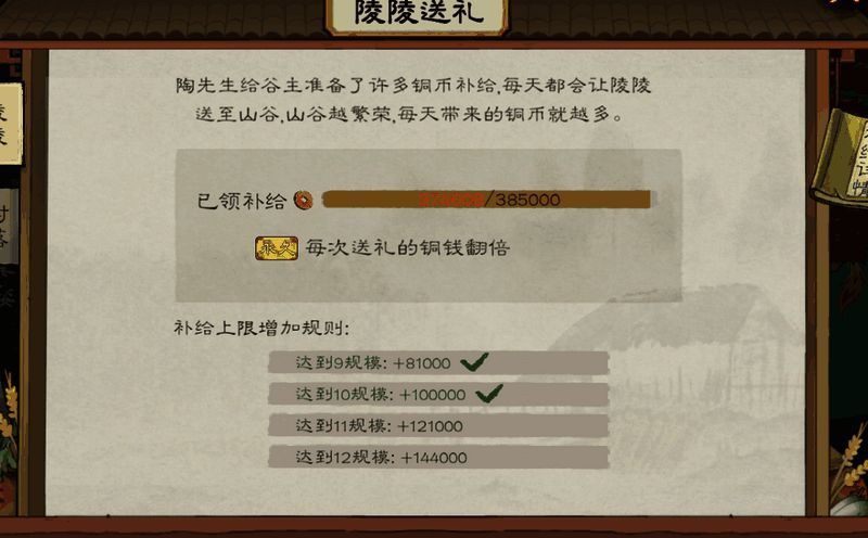 每隔几天村门口会来一位桃谷货郎,游戏第一天记得买空葛根汤,铁锭数量保持在五百即可,每次来都可以刷新三次,每次都买葛根汤,至于种子,够用即可,这个看自己,建议每个种子都囤几千个,用起来也挺快的。