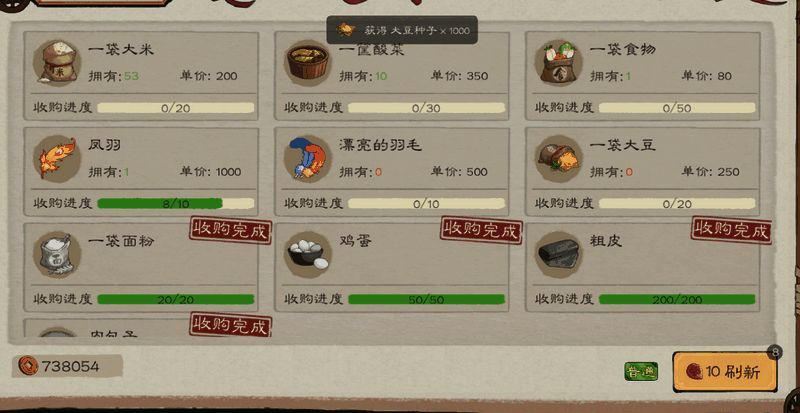 铜币来源:如图一图二所示,图一为一次性,游戏内每一天都可以领取一部分用来前期发育消耗。图二为桃谷货郎收购内容,收购齐全后,点免费刷新,又可以下一轮收购。收购内容大多为杂物,也就是材料-杂物选项里面的,大多都要用到采集和种植,所以农田需要开辟很多,我为了图方便,开了80农田,等白天会录屏语音讲解一个技巧,如何在前期方便管理这么多农田的同时,不影响其他内容,到时候发,记得来看。