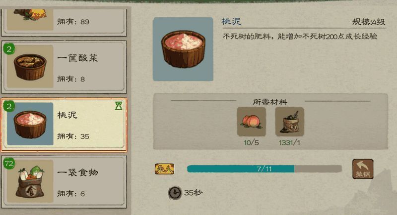 不死树:图一,游戏时间每天都可以给不死树吃8个肥料,前期桃树桃子少,制作的桃泥,吃都不够吃,再加上前期是最需要不死树人口上限的时候,所以不死树基金性价比就凸显出来了,前期过渡更加舒适,桃树在夏秋采摘桃树会掉落,把握好时间采集。