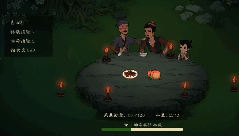 村民体质劳力寿命与每晚家宴的关系:这三个都是经验贴,每晚吃饭以及不死树摇寿果都可以增加这些属性的经验值,换言之,吃得越好,升级越快,劳动力越高,采集建造研究之类的速度越快,效率越高,发育越快,所以吃饭是不能少的环节,长期吃的太烂就会导致全村劳动力低下。