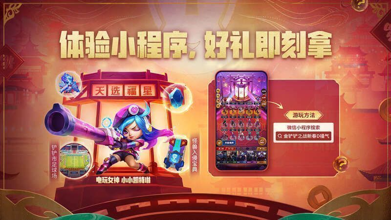 打开微信,搜索小程序《金铲铲之战•新春D福气》,还可以参与天选福星玩法体验,呼朋唤友弈决胜负,热热闹闹过大年。