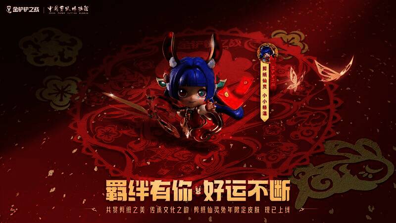 金铲铲之战x中国剪纸博物馆“联盟有你,纸蕴不断”新春庆典活动也正同步开启。非遗大师亲自授艺,与剪纸仙灵小小格温一道领略中国传统民俗剪纸的艺术魅力,将大家对来年的希冀、守护传统的决心、并肩作战的情义汇聚在一方剪纸之上,喜迎新春佳节。