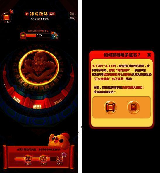 当玩家顺利完成三大主题活动的任务后,便可唤醒御花园藻井中的神龙,同时更可获得由故宫观唐和开心消消乐共同颁发的“开心迎福官”电子证书一张,这牌面妥妥的~