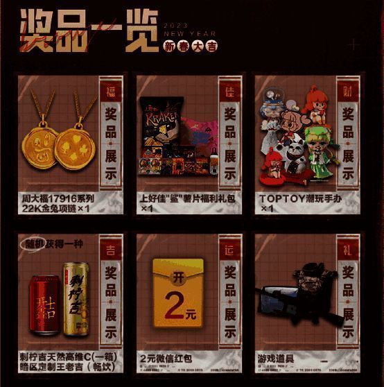 礼盒的奖励超级丰厚哦,只要参与活动就有机会获得以下奖品,先来看看具体都有什么吧:游戏内道具奖励有标准军用手术包,100D战地医疗包;AK74N,5.45*39毫米PP子弹;6B13防弹衣,AK74N。实物奖品有周大福17916系列22K金兔项链、暗区定制王老吉(畅饮)、刺柠吉天然高维C一箱、上好佳“鲨”薯片福利礼包、TOPTOY达利招财猫手办。微信现金红包为2元微信现金红包,品牌优惠券为刺柠吉天然高维C饮料10元优惠券。需要注意的是,实物奖励、微信现金红包和品牌优惠券数量有限,发完即止。奖励如此丰厚,快快带上小伙伴们一起来暗区玩耍吧!