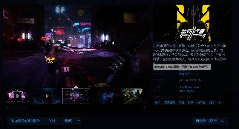 由One More Level进行开发、505 Games负责发行的爽快跑酷砍杀游戏《幽灵行者2(Ghostrunner 2)》,最初在2023年10月26日推出,游戏在Steam平台已收获总体82%好评率的特别好评。