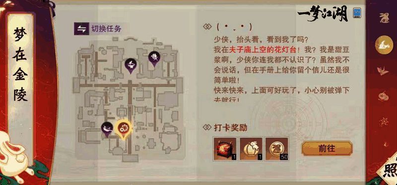与此同时,在繁华热闹的金陵街头,也在发生着不少有趣的故事。在新春将至之时,奇妙夜灯火闪耀之际,少侠不妨于街头找找甜豆浆、图娅、沈袖、李大牛四位侠士,邂逅他们在金陵的这场江湖梦。