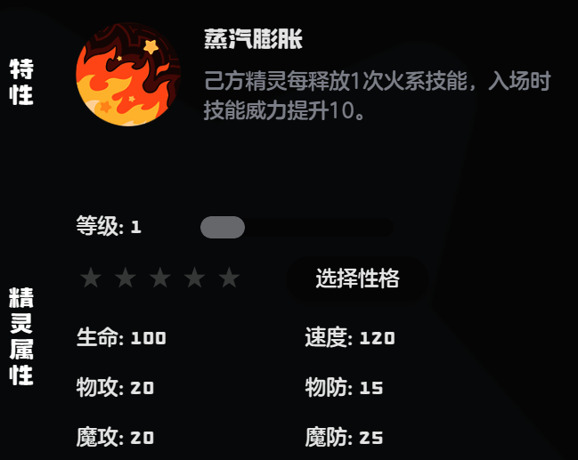 它的生命值为100、速度120、物攻和魔攻分别为20,物防15、魔防25,那我们在给它选择技能时,完全就可以选择物理防御比较高一点的技能,在加上烈焰守护的火属性还能带来灼烧的效果,那技能搭配的选择性就更广了,这里可以使用火焰护盾+山火+灼伤+火焰冲锋或者是火焰护盾+炎打+淬火+爆裂飞弹。