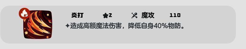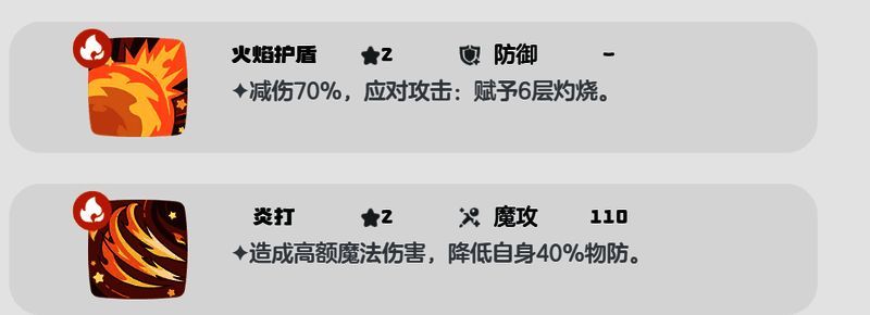 火焰护盾+炎打+淬火+爆裂飞弹这套技能搭配上主要是以魔法攻击为主的,火焰护盾的效果就不用多说了,爆裂飞弹和炎打都属于威力比较高的魔法攻击技能,爆裂飞弹的魔攻有160点,炎打的魔攻有110点,不过炎打在降低自身40%物理防御的基础上可以直接使伤害翻倍,淬火则使可以减少80%的伤害,下回合还能直接使伤害翻倍。