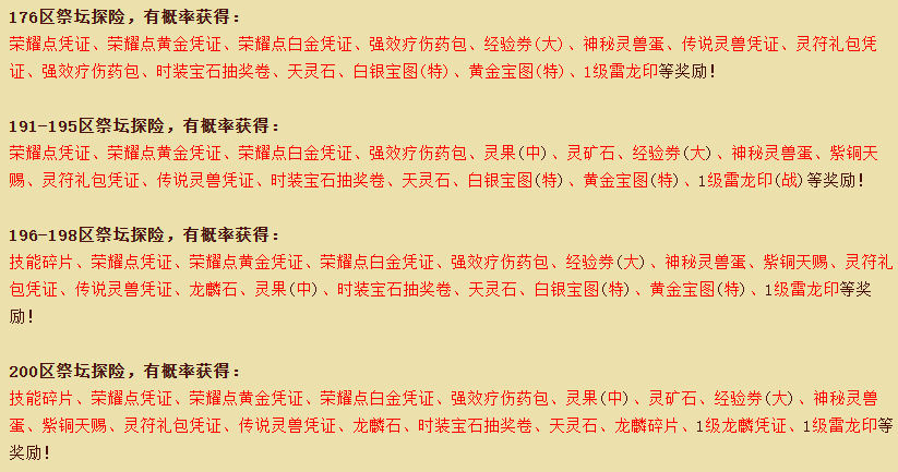 神罚祭坛将免费开放,且越走到祭坛深处,所面对的危险就更加恐怖,但同时,所能获得的奖励也更加丰富!在不同的区服探险,所能获得的奖励也不相同,具体神殿宝藏如下: