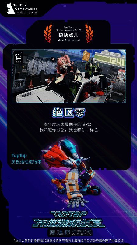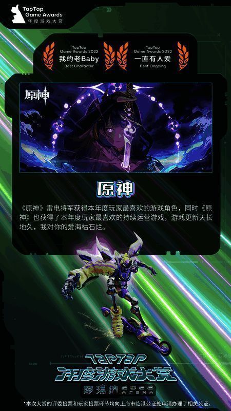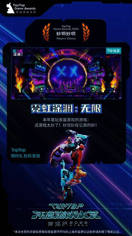 除了专业奖项外,TapTap也为这届大赏呈上了更“新”的菜式:“全新升级的玩家奖项”!别样的命名方式带来“有趣”的第一印象,“妙啊妙啊”、“我的老Baby”、“新的风暴”、“一直有人爱”、“搞快点儿”,全部由玩家票选得出入围名单和获奖游戏。奖项数量的新高也代表TapTap愿意重视玩家的感受和意见。在收获150w张选票后,《霓虹深渊:无限》、《原神》、《明日方舟》、《泰拉瑞亚》等游戏顺利突围进入围名单。