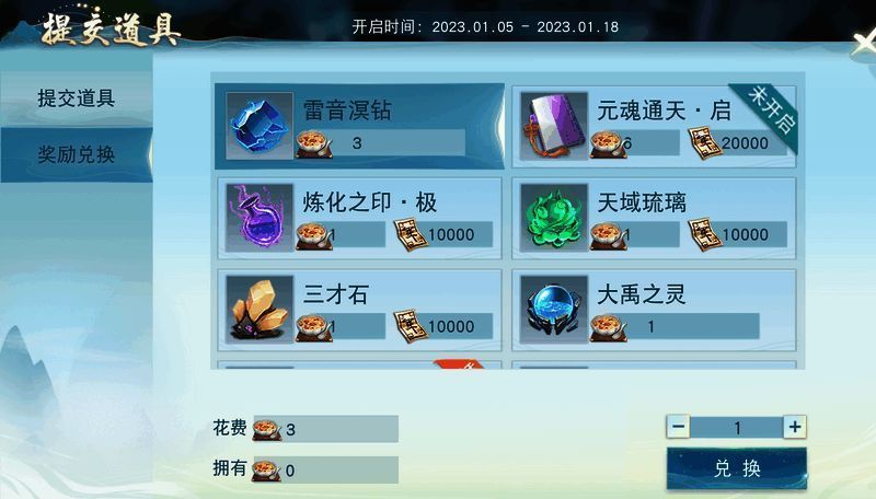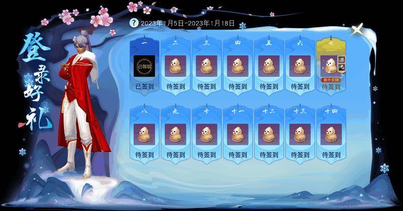 2023年1月5日-2023年1月18日期间上线登陆,即可获得雀儿头奖励,达到指定条件及登录天数后还能额外领取仙灵宝玉、三才石奖励,前往雪漫新岁活动界面,完成指定任务即可获得凛冬宝箱,完成全部任务还能领取雀儿头与丰厚金币!前往声望商店,使用七宝五味粥及雀儿头兑换雷钻、天域琉璃、大禹之灵、金币等各种珍贵道具。