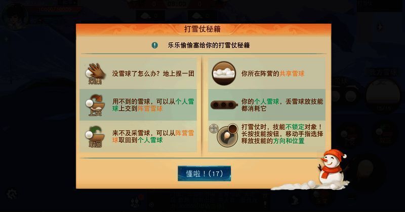 活动期间每日10:00-23:00,前往建木广场接受雪人乐乐的邀请,以个人或者团体为单位参与欢乐打雪仗活动。每天首次获胜可以领取打雪仗首胜宝箱,打开宝箱即可获得雀儿头和初级化雪丹奖励!