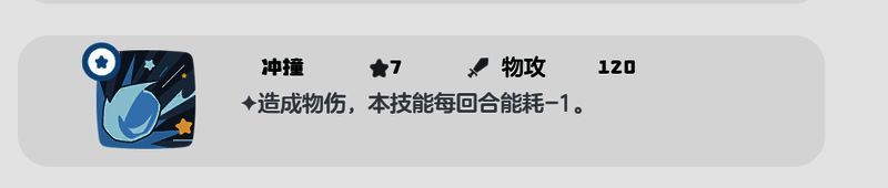120点的物理攻击冲撞是一种耗能非常低的技能,在每个回合使用该技能都可以直接减少1点的耗能。