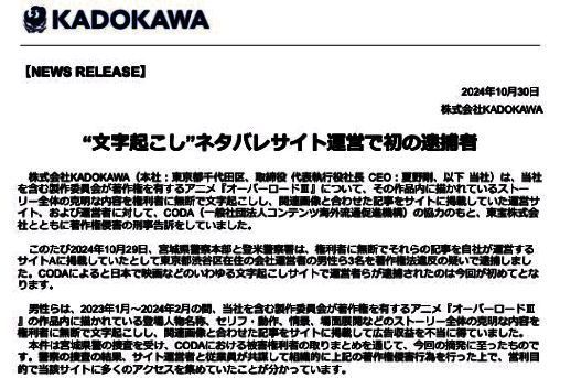 ·不做视频,单纯文字化介绍就没事了?显然在日本同样会被法律制裁,本次案件就是一家专门搞文字化介绍人气动漫的网站被取缔,涉嫌侵犯角川集团旗下《不死者之王3》动画的剧透侵权。