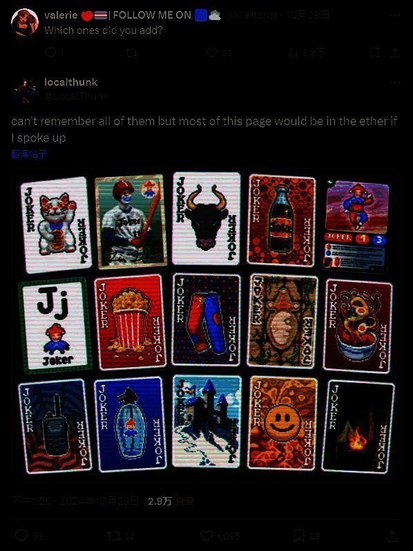 当玩家问他哪些是之后额外添加的时候,LocalThunk表示自己“记不清所有的牌了”,但分享了一张截图,并表示如果他当初指出了发行商的口误,“这一页里的大部分内容都会消失”。这一页里有很多非常棒的小丑牌,像是备用长裤(包含两对每次+2 倍率)、棒球卡(每张罕见小丑拍给予 x1.5 倍率)以及篝火等。