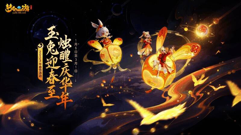 《梦幻西游三维版》2023年春节活动包含万家新岁(单人)、共驱年兽(副本)、再别旧岁(挑战)、新春联欢(休闲)、遍地生财(互动)、玉兔迎春(神兽抽奖)、团团圆圆(宴会)、福至万家(互动)、迎新压岁(奖励找回)、喜气盈门(累登奖励)、福星送喜(商城)、明灯祈福(抽奖)、糖彩熔金(锦衣抽奖)、衔光照夜(坐骑抽奖)、神兔降世(神兽剧情)、新春赠礼(签到奖励)、全服红包、充值返利等多项内容!丰富的经验、金币、物品奖励等各位少侠来拿,还有【超级神兔兑换券】、【神兜兜】、【高级魔兽要诀】等众多大礼等待少侠解锁体验!