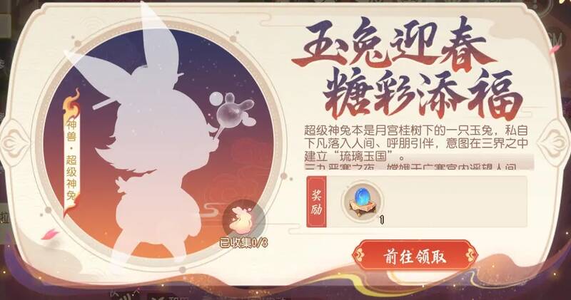 超级神兔本是月宫桂树下的一只玉兔,私自下凡落入人间、呼朋引伴,意图在三界之中建立“琉璃玉国”,有超级神兔左右相随,各位少侠必能心舒体畅,福运长伴。少侠们完成神兔现世任务后可获得阿玉的见面礼,打开见面礼后可领取五宝*1(仅限一次),并解锁超级神兔专属的神兜兜礼包。少侠们也可在活动界面中重温神兽剧情。
