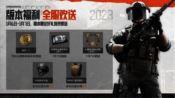新版本自然也少不了各种豪华福利和精彩活动,在版本更新后,各位先锋在1月6日和1月7日两天登陆皆可领取福利,1月6日版本更新后登陆将获得金币*60,1月7日登陆将获得防弹安全箱体验卡(3天)*1、头像框「瑞兔迎春」(30天)*1。此外,参与任意对局1次即可获得KSS战术头盔*1,参与任意对局3次即可获得IND401型防弹衣,奖励丰厚不容错过哟!