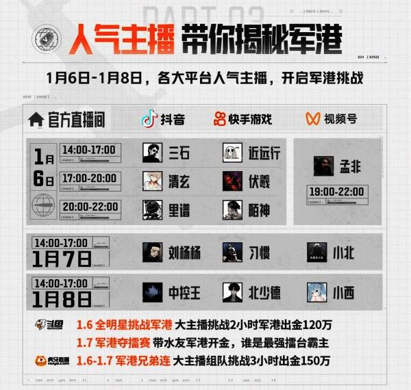除了官方直播间,各直播平台也有相应的精彩活动,例如斗鱼1月6日有全明星挑战军港直播,大主播挑战2小时军港出金120万;1月7日军港夺擂赛直播,带水友军港开金,谁是最强擂台霸主。虎牙也在1月6日与1月7日有军港兄弟连直播,大主播组队挑战3小时出金150万,感兴趣的先锋们千万不要错过哦!