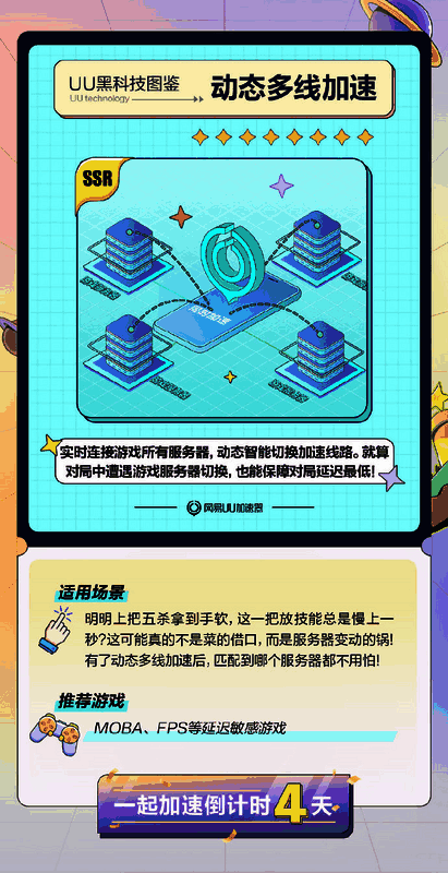 UU加速器目前提供了“动态多线加速”、“高速专网加速”、“基站特权加速”和“UU加速盒2”四大黑科技,给加速效果加BUFF,为大家的游戏之路保驾护航。其中“动态多线加速”专门针对MOBA、FPS等延迟敏感游戏,比如大家在游戏中经常碰到前一局游戏网络非常流畅,下一局就延迟不断,这往往是服务器切换的原因。UU加速器的“动态多线加速”技术在加速后会实时连接游戏所有服务器,动态智能切换加速线路,从而保障大家对局时延迟永远最低。