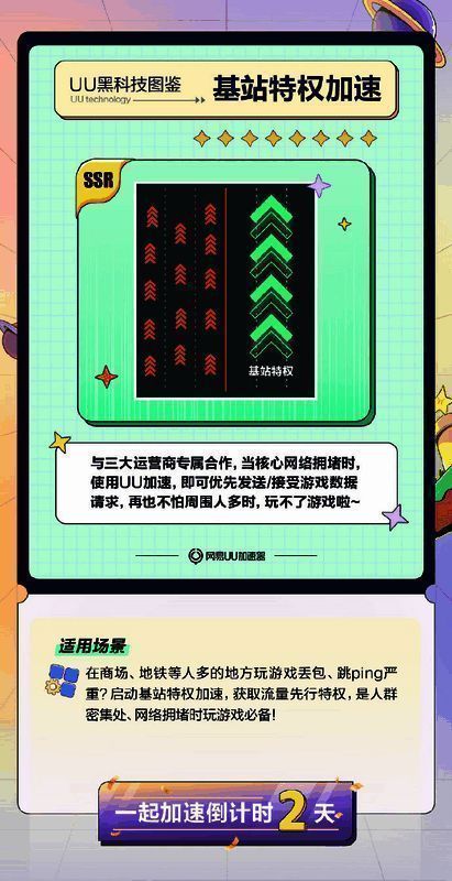 “基站特权加速”是UU解决网络延迟和阻塞问题的一种新技术,在商场、地铁等人多的地方玩游戏,由于网络拥堵,很容易出现丢包、跳ping严重的情况。而使用UU加速后,凭借“基站特权加速”,玩家即可获取流量先行特权,优先发送/接受游戏数据请求,这样即使身处人多的环境中也可以轻松玩游戏了。