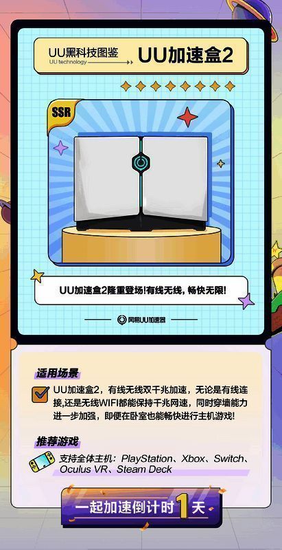 “UU加速盒2”则是UU旗下最新推出的硬件产品。它不仅支持同时加速两台主机,不同主机也能同时加速。并且全新双千兆网口,让玩家拥有更快的下载速度。同时UU加速盒2搭载的高性能WHEMS天线,穿透力比以往更强,客厅安装加速盒,即使在卧室里也能有效提高网络质量。配合UU主机加速APP,让玩家能最快地开始享受游戏,一站式开启联机游戏之旅。