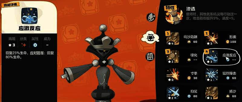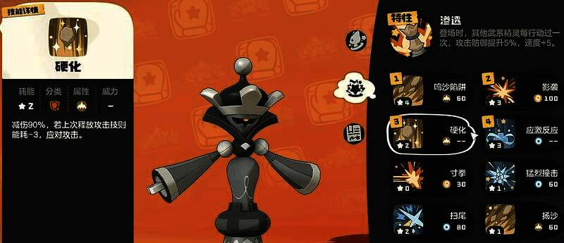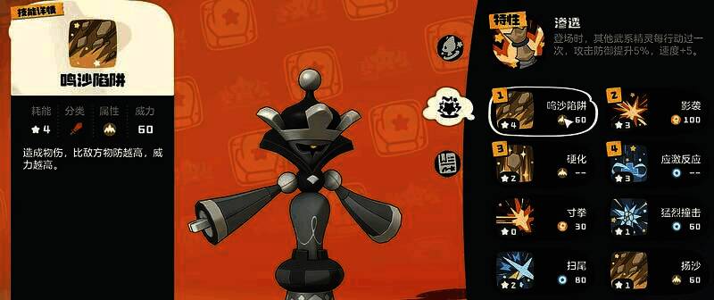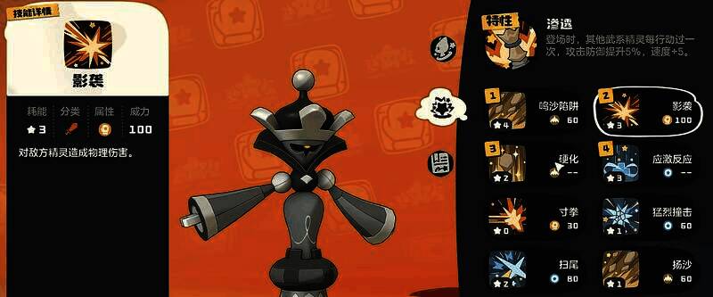 选鸣沙陷阱是因为棋绮后本身就是地系,配合它的特性加防能力,可让棋绮后的物防叠得非常广,到后面很容易出现棋绮后一个鸣沙陷阱就能将对手满血精灵直接秒掉的情况,很契合棋绮后。带影袭则是强化棋绮后的收割能力,避免将鸣沙陷阱用在一些本就残血的精灵身上。