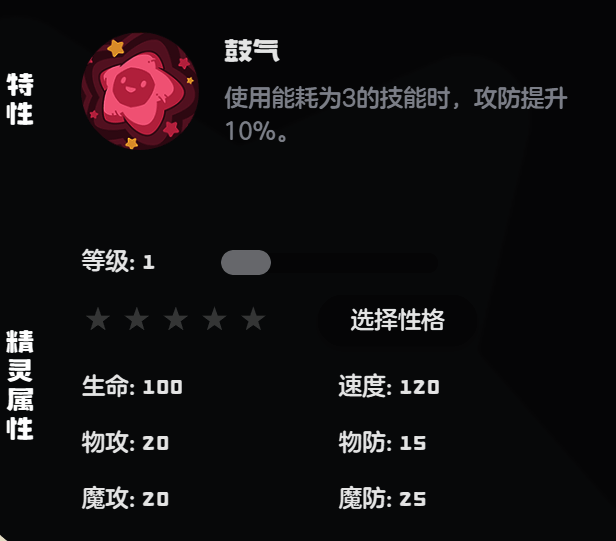 梦想三三的初始属性为生命100、物攻20、魔攻20、速度120、物防15、魔防15,比如说我们需要增加梦想三三的物攻,那就需要选择固执的性格,性格的选择不仅决定着梦想三三的属性同时还决定着我们选择什么样的技能。