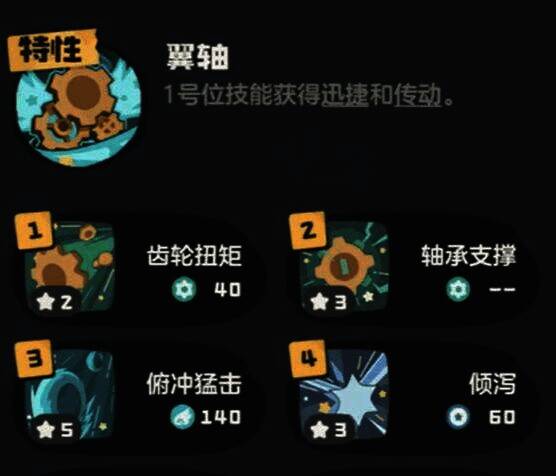 如图中所示,小编所推荐的技能就是这4个。其中齿轮扭矩这个技能能够有效搭配被动,强化角色的输出。而轴承支撑也是同理,能够更有效地减少角色的消耗。在此基础之上,俯冲猛击这个技能是高威力的输出技能,倾泻这个技能在有一定输出的同时还能够消除双方的印记效果,功能性非常强大。