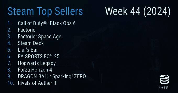 Steam最新一周销量榜出炉(2024年10月22日-2024年10月29日),本周《使命召唤:黑色行动6》成功登顶,终结了《七龙珠 电光炸裂!ZERO》的三连冠。