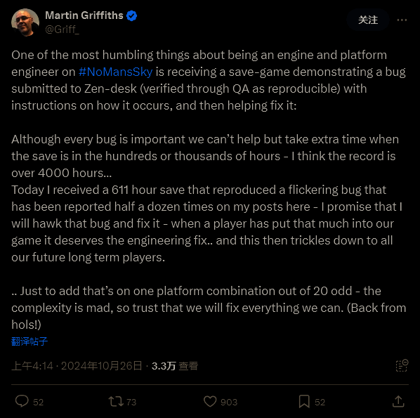 收到存档文件后,他承诺自己会“找到并修复 BUG”,因为“当玩家在我们的游戏中投入那么多精力时,理所应当就该获得专门的工程修复”。修复个例问题也将能让他们未来可以更好的帮助更多长期玩家。