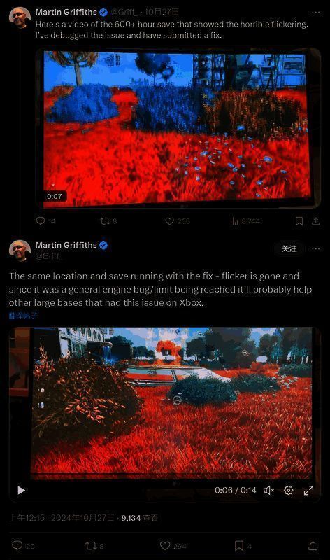 游戏的引擎程序员 Martin Griffiths 最近透露,自己帮助一位游戏的粉丝修复了它游玩长达600 多个小时的游戏存档。在社交媒体上,他表示帮助忠实的粉丝修复 BUG 是工作室的首要任务:“虽然每一个错误我们都很重视,但当投入了上百甚至上千——我记得纪录最高是4000 小时——的存档出错时,我们忍不住会花些额外时间去修复它们。”这位玩家的存档并不是完全损坏,而是游戏中的物品不停的频闪。据 Griffiths 称这种存档损坏 BUG 他已经受到了 6次不同的报告。