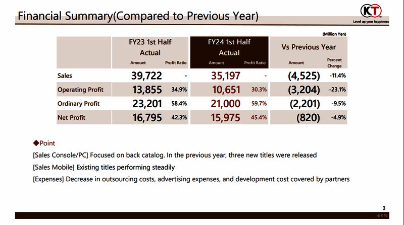 近日,光荣特库摩公布了2024年4月至9月上半财年的财报数据,其中显示,光荣特库摩本财年上半年销售额为351.97亿日元,较上财年同期下降11.4%,营业利润为106.51亿日元,较上财年同期下降23.1%,这是由于PC、主机、在线和移动设备游戏销量总体下降造成的。