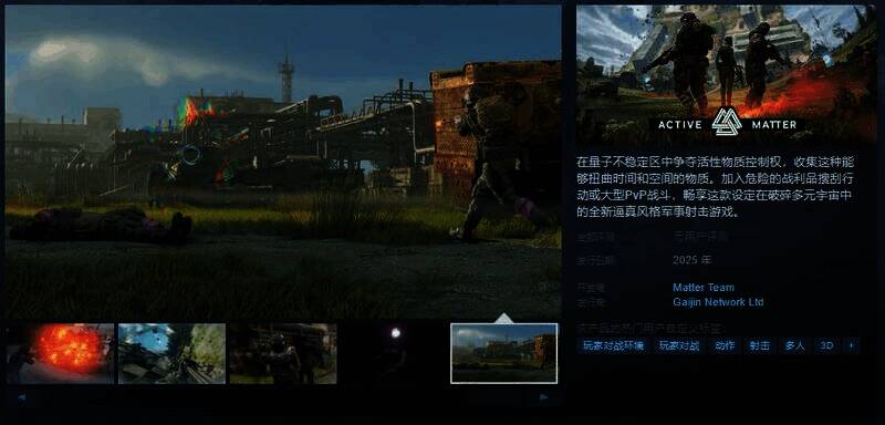 今日(10月29日),逼真风格军事射击游戏《Active Matter》Steam页面公布,发售日待定,暂不支持中文,感兴趣的玩家可以点击此处进入商店页面。