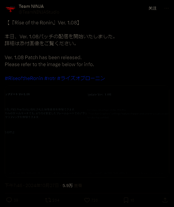 由忍者组开发的动作角色扮演游戏《浪人崛起》日前推出了1.08 版本更新,正式支持 PS5 Pro 主机。