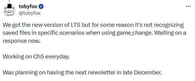 Toby Fox在文中表示,他和他的开发团队近日收到了开发引擎GameMaker LTS的新版本,但出于某种原因,游戏无法识别已存档的文件,因此他正在等待引擎开发人员对此的回应。而目前,他每天都在开发《三角符文》的第五章,计划在12月底发布下一期的开发简报。