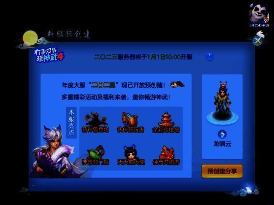 新年大服“二〇二三”将于2023年1月1日重磅开启!现已开放角色预创建,少侠可以先前往战盟或游戏内抢先预约创建角色。欢迎各位少侠入驻,享受新年大服的诸多福利活动!新年大服“二〇二三”将开启“新服神兽礼”特别活动,达到目标等级即有机会抽取到新神兽兔无双。还有更多新服专属活动,福利奖励送不停!