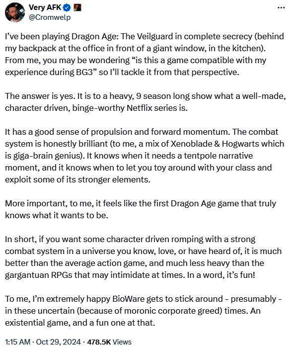 《龙腾世纪4:影障守护者》媒体评分已解禁,许多媒体和评测者对该作的评价纷至沓来。《博德之门3》发行总监Michael Cromwelp Douse也发推文,给予《龙腾世纪4》高度评价。他认为这是一款“真正知道自己想要成为什么样子的《龙腾世纪》”,值得RPG粉丝花时间去体验。