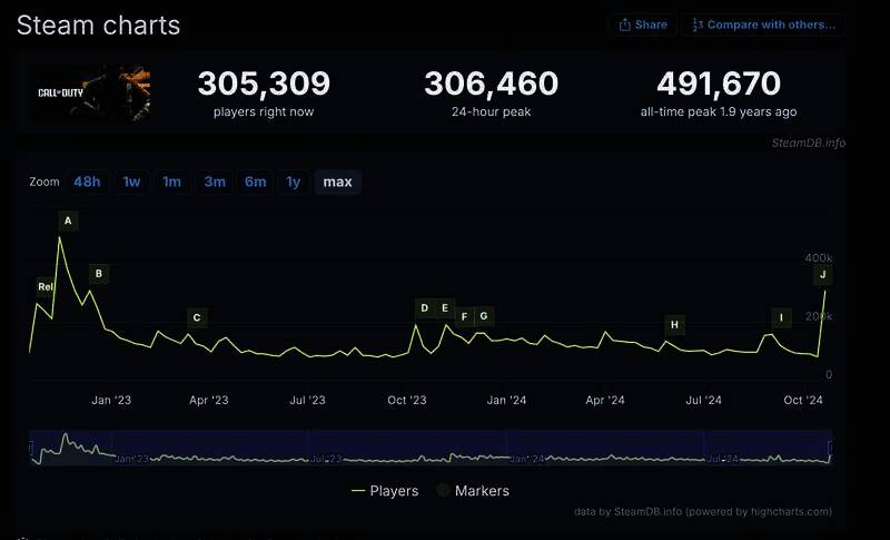 据SteamDB数据显示,《使命召唤21:黑色行动6》Steam同时在线玩家数峰值已破30万,这一数字高于《黑色行动6》的前两部作品。2022年的《使命召唤19:现代战争2》最高同时在线人数超26.3万,去年的《使命召唤20:现代战争3》最高同时在线人数超19万。