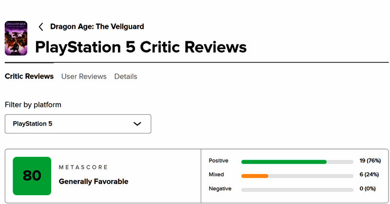 《龙腾世纪:影障守护者》即将正式发售,目前有关该作的评分已经解禁,截止发稿时,M站该作PC版评分88,PS5版评分80,但目前pc版仅六位媒体评分。