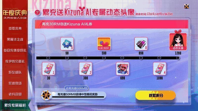 活动期间累计充值可得多样好礼,包含动态头像“Kizuna AI动态头像”等独家奖励!