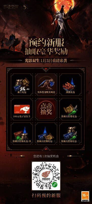 《猎魂觉醒》贺岁新服“光影双生”也将于1月5日随五周年庆典重磅开启,即日起可参与新服有奖预约!微信扫码即可进入新服预约小程序,订阅成功即可参与九宫格抽奖,本次抽奖100%必得奖励!奖池包括苍龙木质机械传动模型、100元京东卡、觉醒果实、高级讨伐证兑换券等惊喜好礼,不可错过!