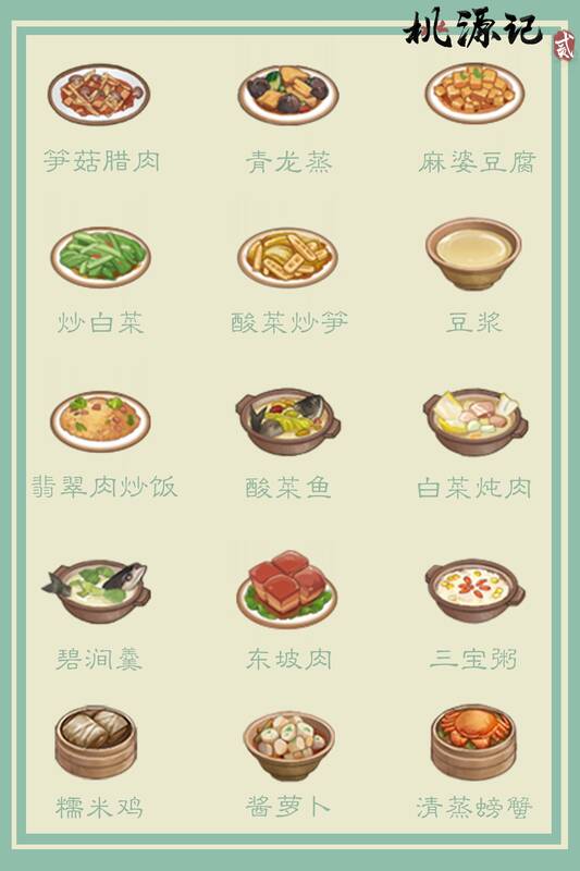 桃源记2都有什么菜,游戏中有不同菜品拥有不同营养和饱食度,桃谷里的菜品多种多样,玩家们有没有收集齐呢,接下来跟随小编一起来看看游戏里都有哪些美味佳肴吧,看看还有没有你没有收集到的菜品。