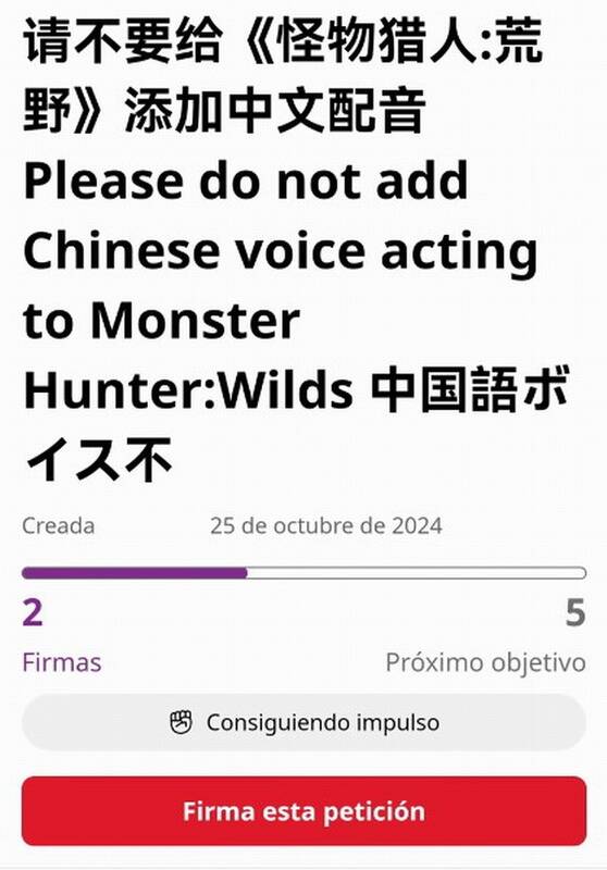 然而在该请愿网站上还有玩家发起另一个请愿,呼吁卡普空不要在《怪物猎人:荒野》里加入中文配音。