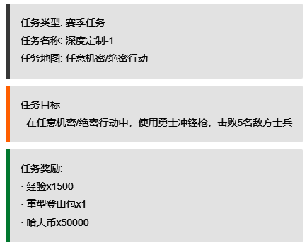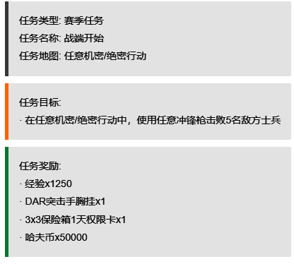 在任意机密/绝密行动中,使用勇士冲锋枪,击败5名敌方士兵。