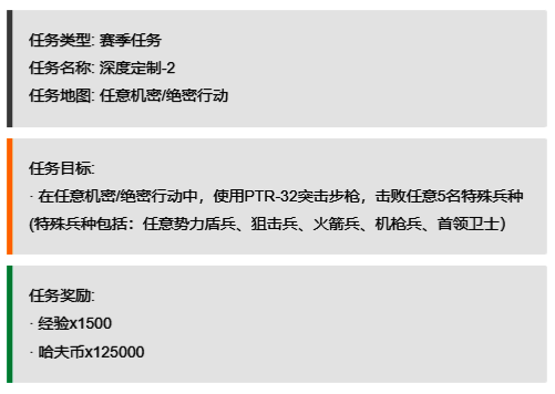 在任意机密/绝密行动中,使用PTR-32突击步枪,击败任意5名特殊兵种(特殊兵种包括:任意势力盾兵、狙击兵、火箭兵、机枪兵、首领卫士)