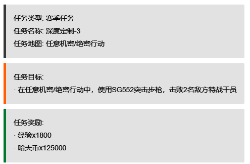 在任意机密/绝密行动中,使用SG552突击步枪,击败2名敌方特战干员。